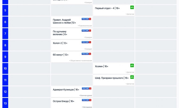 На телеканалах собственного производства «Триколор» зрители тоже отдают предпочтение советскому кино и криминальным драмам. Самыми популярными из них стали «Офицеры» («День Победы»), «Солдат Иван Бровкин», «Вечера на хуторе близ Диканьки» («Советская киноклассика»), «Последний мент» («Криминальное»).