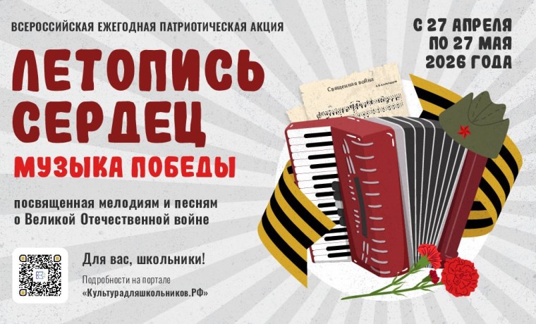 С 27 апреля по 27 мая 2026 года в рамках межведомственного культурно-образовательного проекта «Культура для школьников» пройдет Всероссийская ежегодная патриотическая акция «Летопись сердец. Музыка Победы».