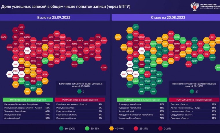 Также были озвучены данные по исполнению поручений в рамках проекта «Создание единого цифрового контура в здравоохранении на основе ЕГИСЗ». ЧР вошла в ТОП-5 субъектов в России с высшей оценкой в доле успешных записей на приём к врачу в общем числе попыток записи через ЕПГУ.